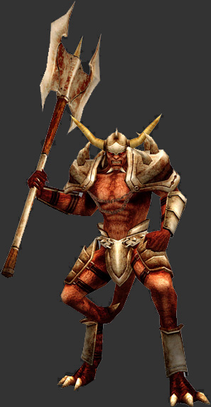 The semi-boss monster of Valley of D’evah that appears twice a day around the entrance of Tower of D'evah:Strikes down with a big axe:Uses a wide-range attack by focusing its power on the axe and striking down:Causes damage widlely by summoning lighting attack:Causes to stun widely by flourishing its axe around:Sometimes by mesmerizing enemies with a yell, reduces their current HP by 90% and causes to stun