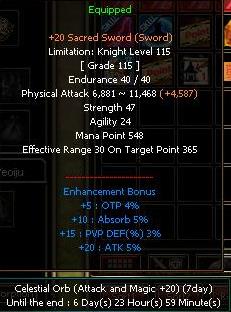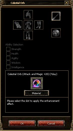 Using a Celestial Orb item in a desired slot temporarily increases the enhancement level of the equipped item.