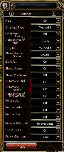 - Automatic Skill : use skill with number key without mouse click(on/off)