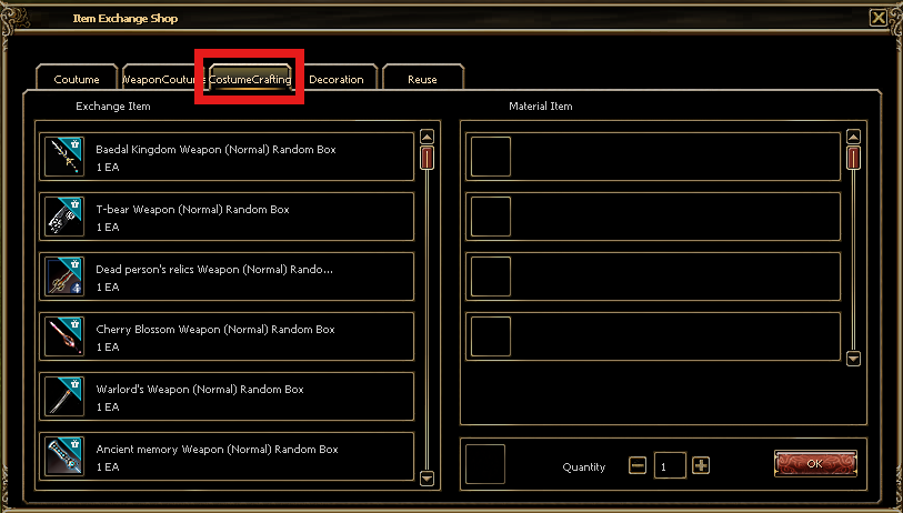 You can craft various Weapon/Armor costumes (normal) by using items obtained from defeating level 70 monsters and items purchased with Honor Reward Points through the "Treasure Manager" NPC.