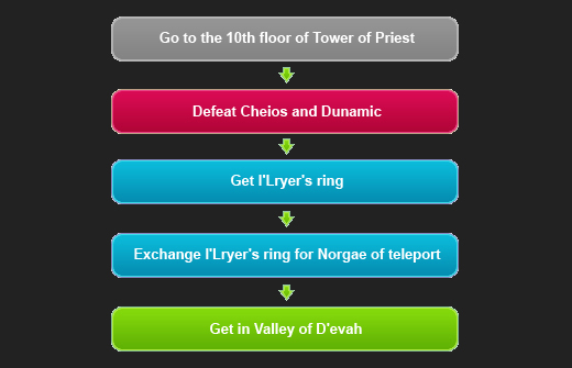 Defeat the summons ‘Cheios’ and ‘Dunamic’ on the 10th floor of Tower of Priest, acquire ‘I’Lryer’s’s Ring’ and go from Geum-hOh Mine to Ohdo Gorge