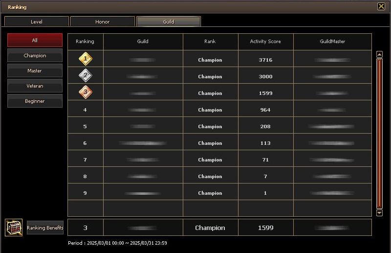 The guild ranking level is determined as Champion/Master/Veteran/Beginner, and if there are no activity points, they are not counted in the ranking.
