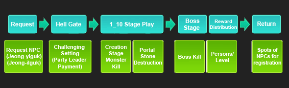 Once all monsters are eliminated, Portal Stone (Seal of Hell) is generated. Destroying the Portal Stone moves you to a next stage. ·The following flowchart shows the advancement in the Picture of Hell dungeon.