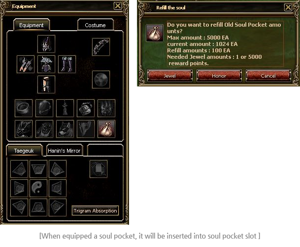 -Soul Pocket charge can be possible with reward honor points or jewels.