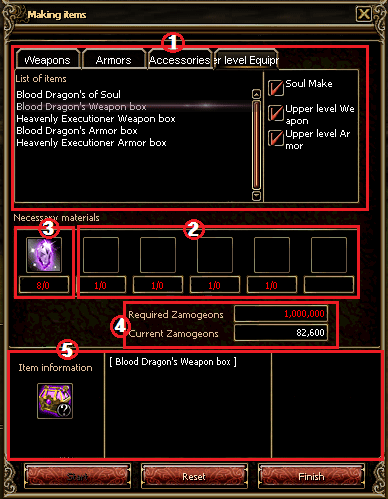 Produce upper level weapons and armors with materials. Upper level equipment Combines the materials required for production. |