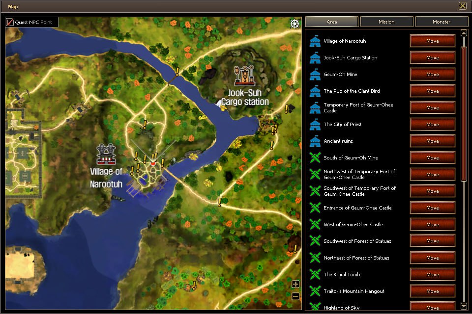 The World Map UI displays your current character location along with the Area/Mission/Monster tabs.