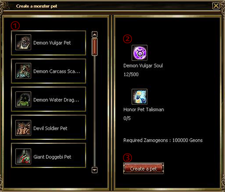 - When you can click Monster Pet Creation Icon or Press “L” button, a Monster Pet Creation window will be displayed.
