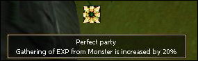 - Members under the buff effect of Perfect Party can get additional experience point(20%) out of monster hunt. (The buff effect of Perfect Party can be applied together with that of Stone of EXP.)