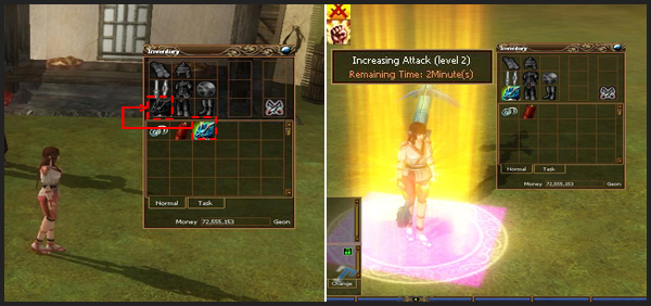 3) Pick a pet out of inventory and equip it on a character, and then certain buff effects will run by a certain chance with a certain cycle time.