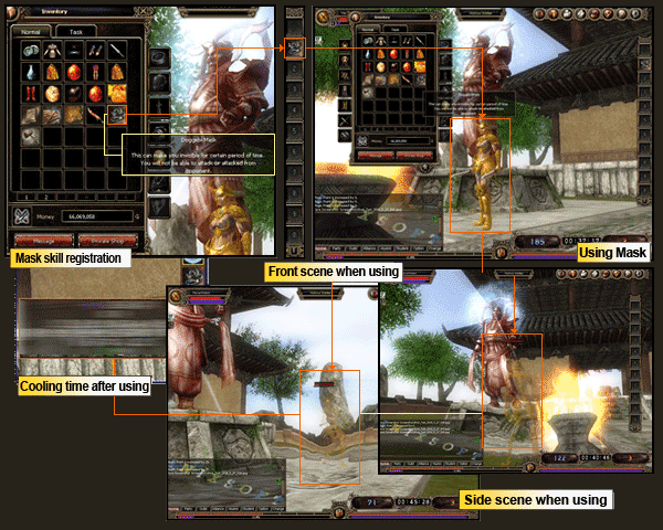 Doggebi Mask | By using this mask, you can be invisible for 10 seconds and others will not be able to attack you. Also, you will not be able to attack others as well. |