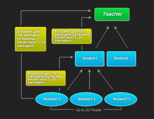 In accordance with student's level, teacher can get some amount of Zamogeon, about 5~20 geon, as tuition fee from his students' Zamogeon gathered by hunting.