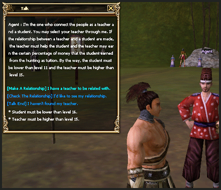 In case of players in Lv.15 and below, they can contact the NPC "Agent" in Narootuh and get any teacher. Click [Make A Relationship] and enter a teacher's name.