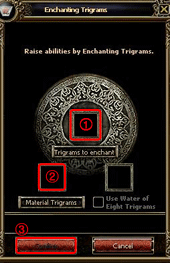 Material Trigram (Not enchanted) will be put here automatically when Trigram to enchant is put. And the name of Trigram to enchant and Material Trigram should be same.