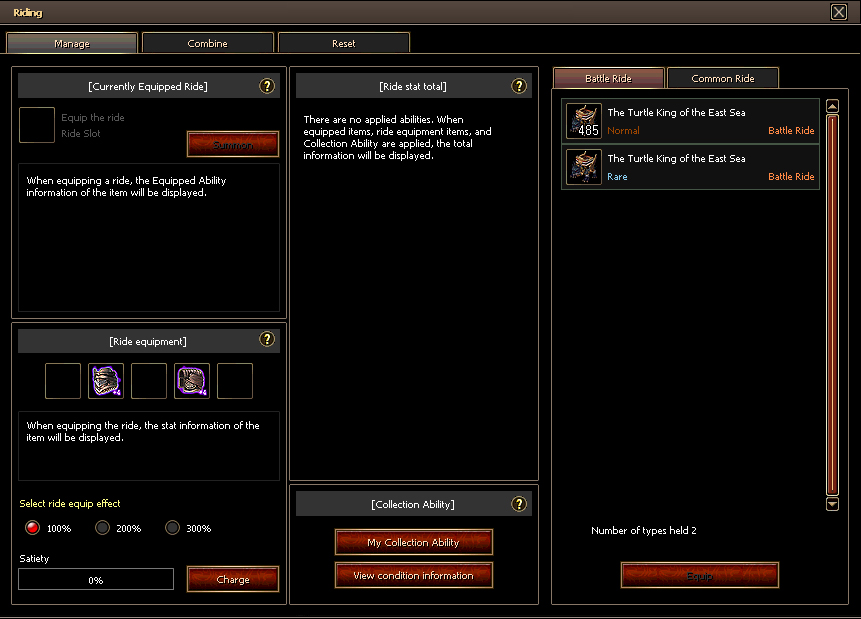 - Satiety is required to maintain battle horse equipment effects, and the satiety value you have decreases based on the 'number of hits from skill use'.
