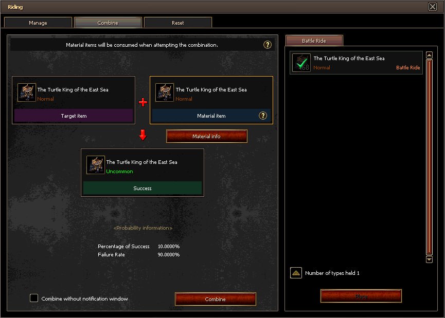 - Battle Horses have a total of 4 grades, from Normal to Epic, and you can increase the grade through [Combine].