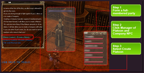 2. To form a Platoon, speak to “Manager of Platoon and Company NPC” in the 10th floor of Tower of Priest.